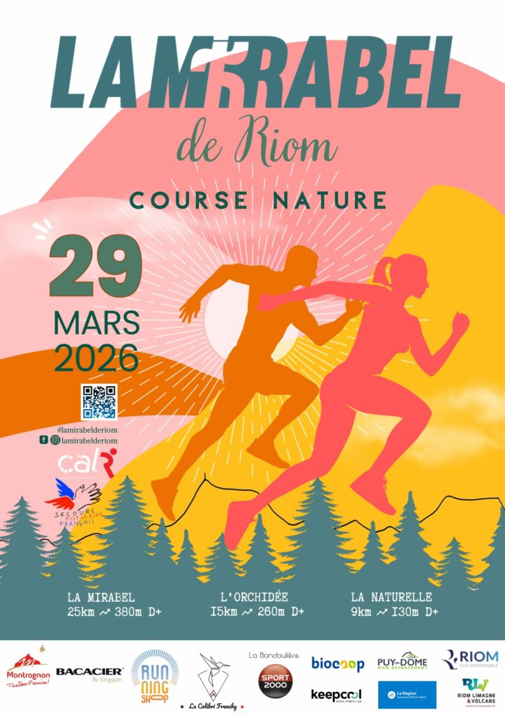La Mirabel de Riom, c’est trois parcours sur la colline de Mirabel au sud de Riom : La Mirabel (25 km, 380 m de dénivelé), L’Orchidée (15 km, 260 m de dénivelé) La Naturelle (9 km avec 130 m de dénivelé). A vos agendas… la prochaine édition aura lieu le dimanche 29 Mars 2026. Dans le cadre de notre démarche éco-responsable, il n’yaura pas de gobelets aux ravitaillements, merci de prévoir un éco-cup.